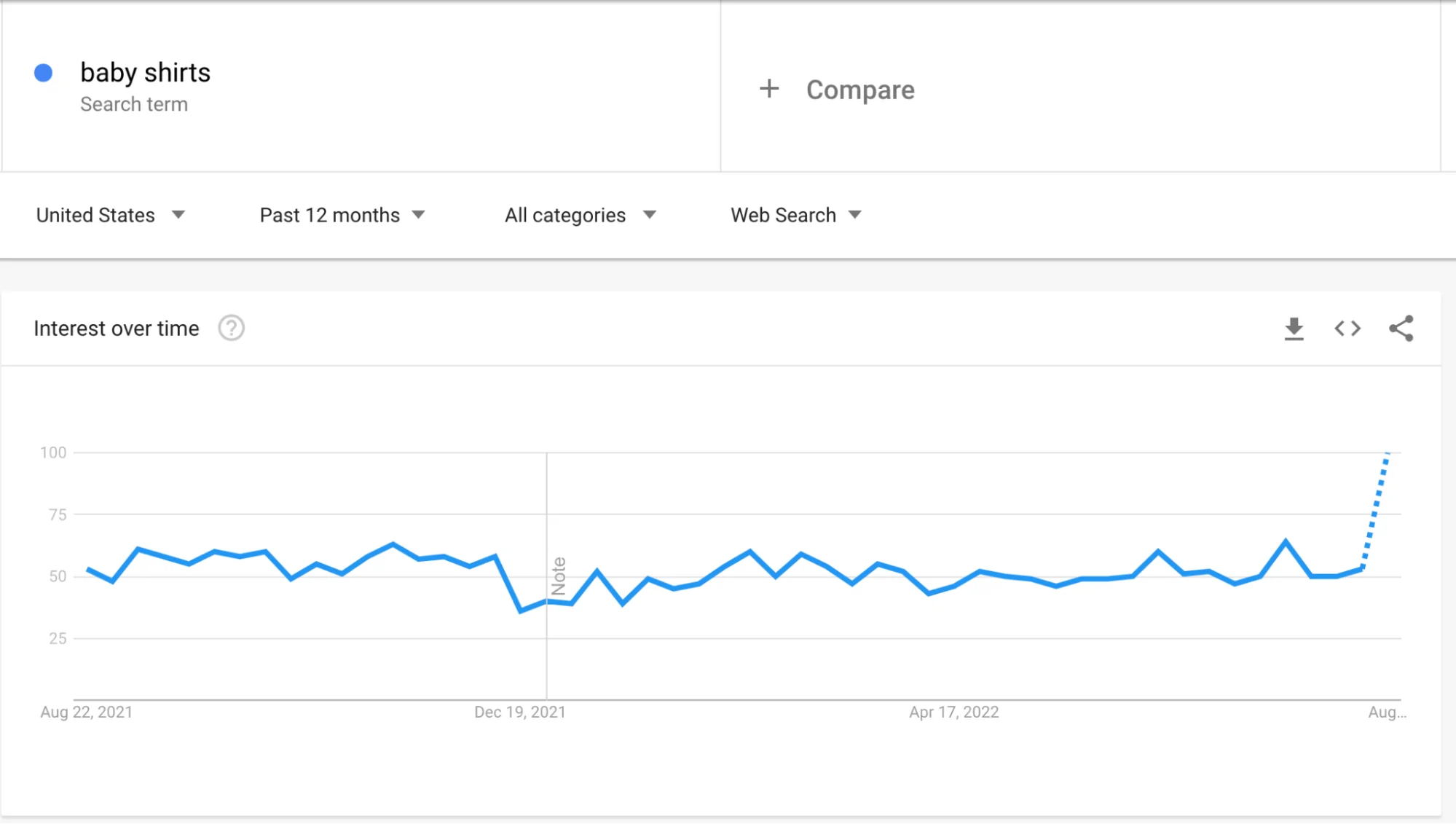 新父母最近流行的一种产品是婴儿衬衫。Google Trends 显示我们即将达到对该产品的最高兴趣,因此如果您正在寻找具有经过验证的需求的畅销产品,请考虑快速行动。